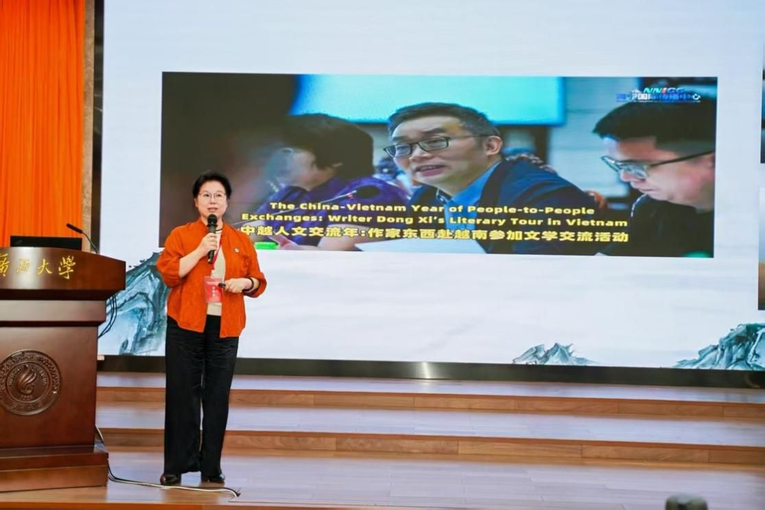 杨学明首先从理论根基、现实挑战和破题关键等几个角度入手,以自治区级课程思政示范课、红色故事讲述人、平陆运河影像展、春平声音工作室、逐影系列作品展等丰富的案例,分享了我院构建“三维联动”教育实践体系的探索和尝试;接着又结合“推动构建周边命运共同体”的主题提出了三点思考:如何将民族文化符号转化为国际传播的资本价值、如何发挥广西边境地区作为国际传播大窗口的形象价值、如何挖掘民族院校在构建人类命运共同体中的独特价值,同时分享了我院在承办“看中国·广西行”活动、签约国门微短剧孵化基地、参与周边外交系列项目策划实施过程中的体会和感受。