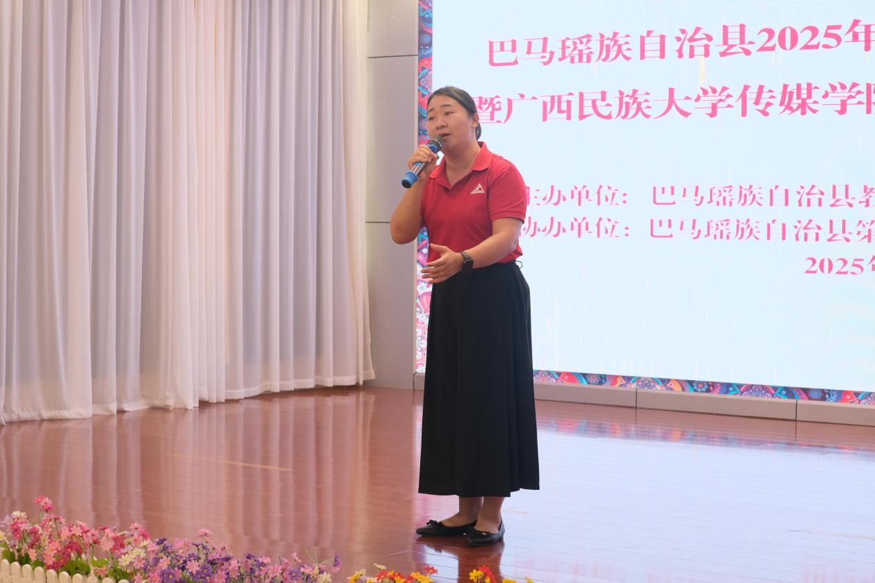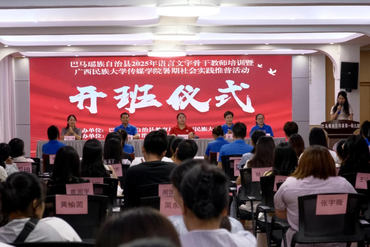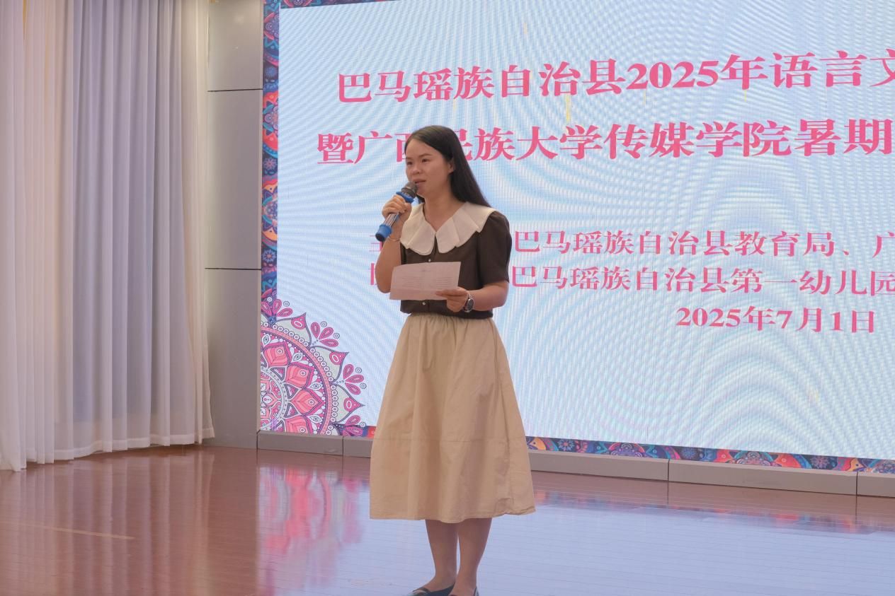 7月1日上午,巴马瑶族自治县2025年语言文字骨干教师培训暨广西民族大学传媒学院暑期社会实践推普活动开班仪式在巴马瑶族自治县第一幼儿园举行。巴马瑶族自治县教育局副局长黄榆茵、巴马市语委办负责人简东升、第一幼儿园园长杨樱;广西民族大学传媒学院林余荫、徐华、徐辉丽老师以及全县各中小学、幼儿园七十余位语言文字骨干教师、广西民族大学十一位“三下乡”志愿者共同参与了这场融合诵读技巧传授与文化传承的教育活动。