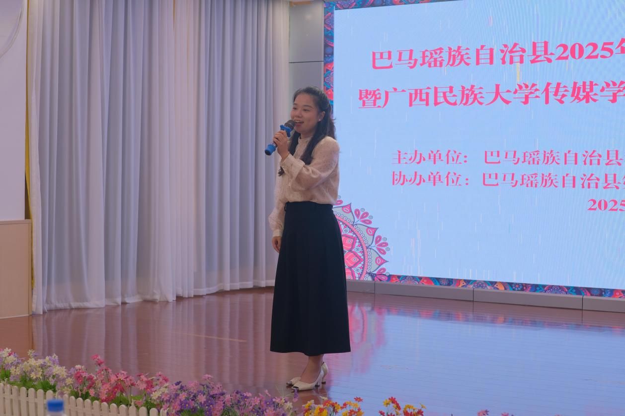 黄榆茵致辞欢迎广西民族大学暑期社会实践团队的到来。她表示,为推动巴马普通话及与经典诵读技巧提升,特举办此次活动;希望通过活动赋能师生语言能力,并期待未来双方能有更多合作机会,持续深化相关领域的交流与发展。上午的活动通过现场演绎和点评的方式展开。教育局副局长黄榆茵与十位来自中小学及幼儿园的教师,进行了经典诵读演绎。