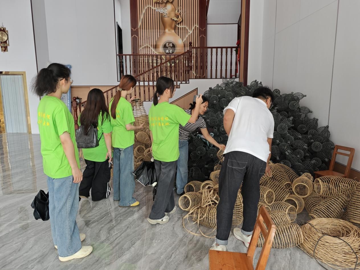 6月30日,团队成员首先来到地苏镇丹阳村藤编非遗展示馆,馆内陈列着琳琅满目的藤编工艺品,从精美的花篮到栩栩如生的动物造型,每一件作品都展现了当地藤编技艺的高超水平。在村委的讲解下,团队成员深入了解了藤编的历史渊源、制作工艺以及其在乡村振兴中的重要作用,深刻感受到非遗文化的独特魅力。随后,团队前往都安丹阳藤编中小学生研学实践教育基地参观。该基地去年累计接待学生约1万人次,不仅是传承非遗技艺的实践场所,更成为青少年了解民俗文化、体验手工技艺的教育基地。