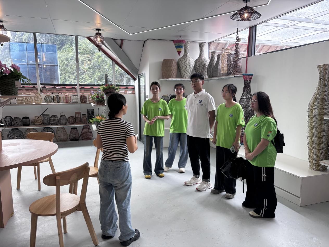 7月5日,团队成员们探访大定村瑶家湾民宿和藤编工艺样品间。民宿内,藤编家具、装饰品与现代设计巧妙结合,吸引游客体验;样品间陈列着的传统工艺精品,成为展示非遗文化的窗口。大定村村委会韦副主任表示,当地正尝试通过“文旅+产业”模式提升藤编附加值,并计划引入电商直播拓宽销路。调研过程中团队发现,大定村在推进产业升级时面临资金筹集困难、村民参与度不足和缺乏积极性等问题。对此,团队成员们也提出了合理建议:年轻人对直播带货接受度高,可作为大定村产业升级变革的突破口,未来需通过培训激励和政策扶持等方式来调动村民积极性。