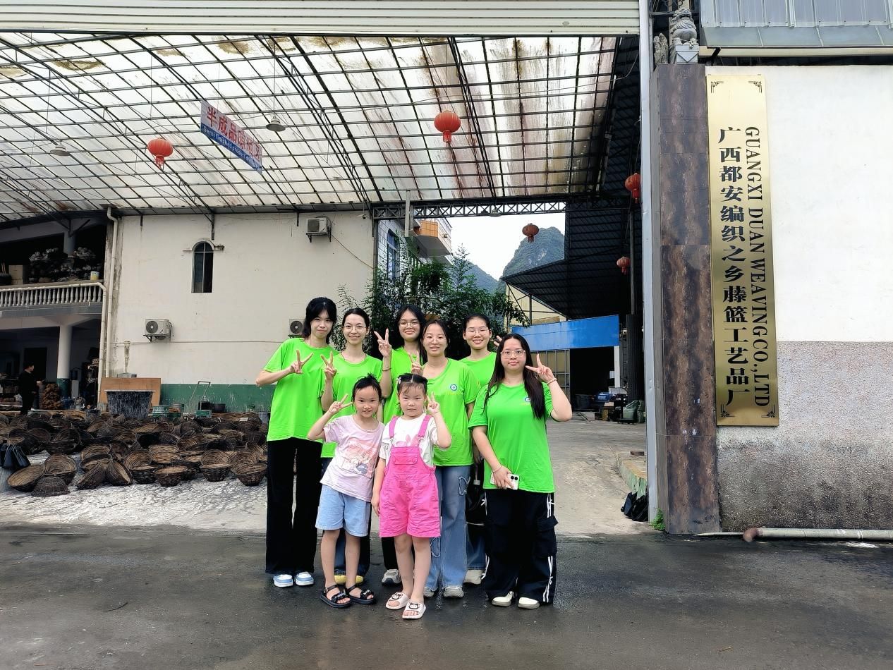 (团队成员在广西都安编织之乡藤篮工艺品厂合影)