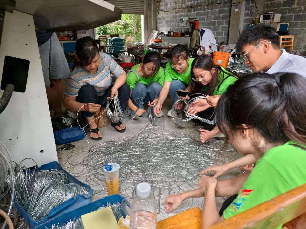 7月1日至2日,团队成员深入农户家中,对藤编工艺品制作流程进行实地参观调研。农户们借助机器将铁线进行切割和焊接,完成从细直铁线到弯曲缠绕的复杂模型打造。从简单的篮子框架到复杂的动物模型,每一款都凝聚着村民们的智慧和心血,这不仅是藤编工艺的展示,更是创新设计的体现。在编织定型环节,村民们将处理好的金丝藤、玉米叶等编织材料缠绕在模型上,再用细线加以固定,结合不同材料特性调整编织手法,最终形成一个个精美实用的藤编手工艺品。
