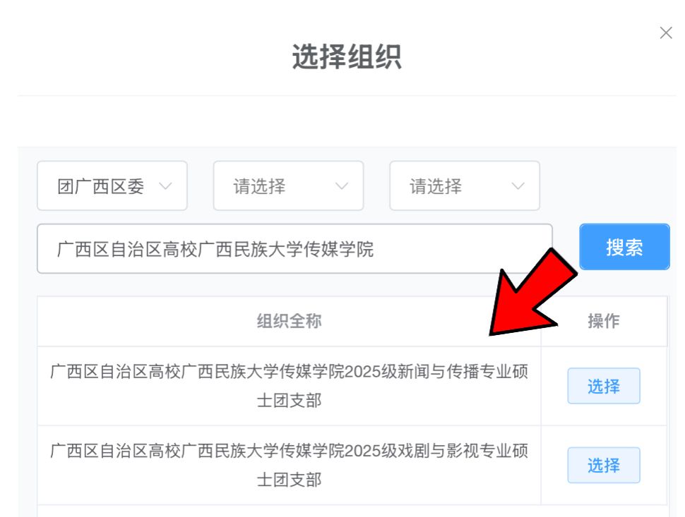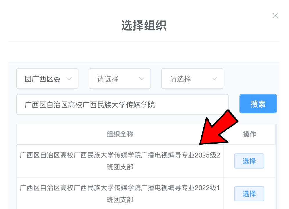 本科生选择“团广西区委”,在搜索栏搜“广西区自治区高校广西民族大学传媒学院”,然后相应在2025级相关专业班级。