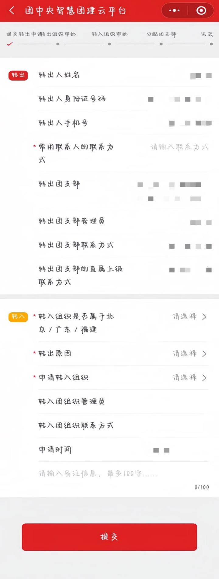 可在提交时看到转出和转入组织的联系人电话,可致电联系,加快审批。转入各班级团支部请等待后续通知。
