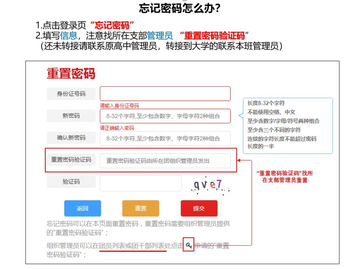 所有团员应已在原高中注册或使用过该系统,如无法正常登录或遗忘修改后的密码请联系原高中学校。