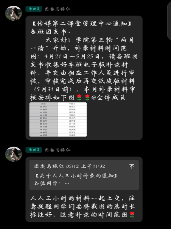 负责到梦空间系统管理与活动审批,对接学院老师和校二课中心,招募活动观众并考勤,处理学院团体及个人积分补录,学年末对积分不达标同学进行预警。