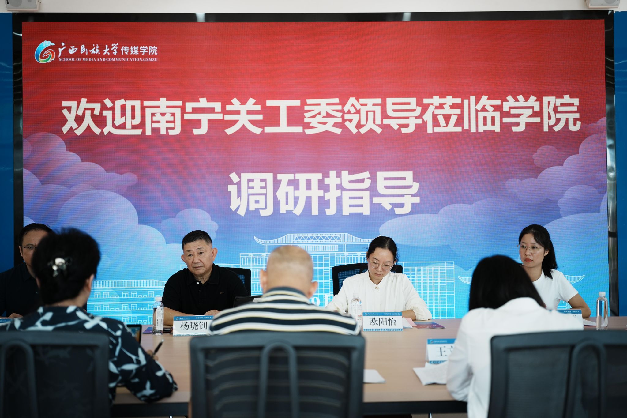 9月11日上午,南宁市关心下一代工作委员会一行莅临传媒学院明德楼大厅一楼开展调研指导工作。南宁市关工委副主任杨晓钊、共青团南宁市委副书记欧阳怡等六位领导嘉宾,传媒学院党委书记黄焕汉、院长杨学明等六位学院领导及教职工代表出席此次交流会,会议由杨学明主持。