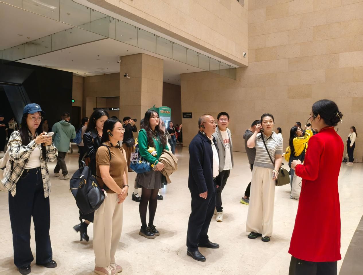 在河南博物院的参访过程中,一幕动人的场景成为此次走访的生动注脚。担任此次讲解任务的是传媒学院2023届播音与主持艺术专业优秀毕业生黄月明。她以扎实的专业功底、流畅的语言表达和饱满的讲解热情,引领母校领导一行穿越千年华夏文明,细致梳理中原历史脉络,娓娓道出文物背后的故事。她的出色表现,不仅赢得了现场观众的频频赞许,更生动展现了我校毕业生卓越的专业素养与昂扬的精神风貌,成为民大育人成果在中原大地上的鲜活例证。