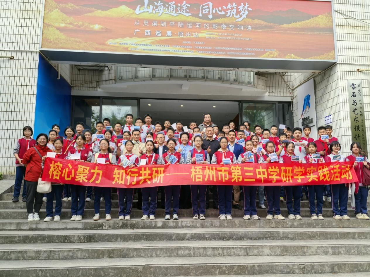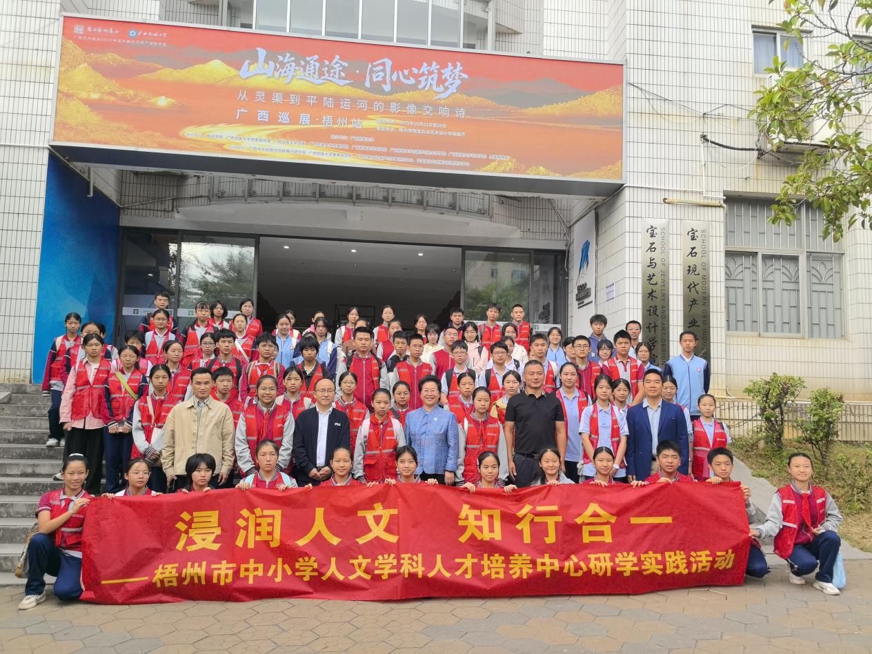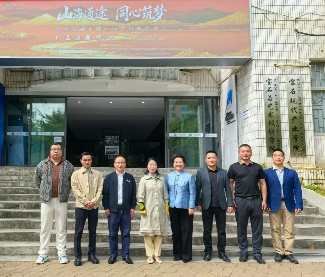 当天,梧州市委教育工委书记、市教育局党组书记、局长覃映霞,梧州学院宝石与艺术设计学院院长贠禄,梧州学院发展规划处、研究生处副处长王学良,梧州学院文化与传媒学院副教授郑文峰,百川文化传媒公司执行董事、总经理于世川等与梧州市师生代表一同观看了展览。