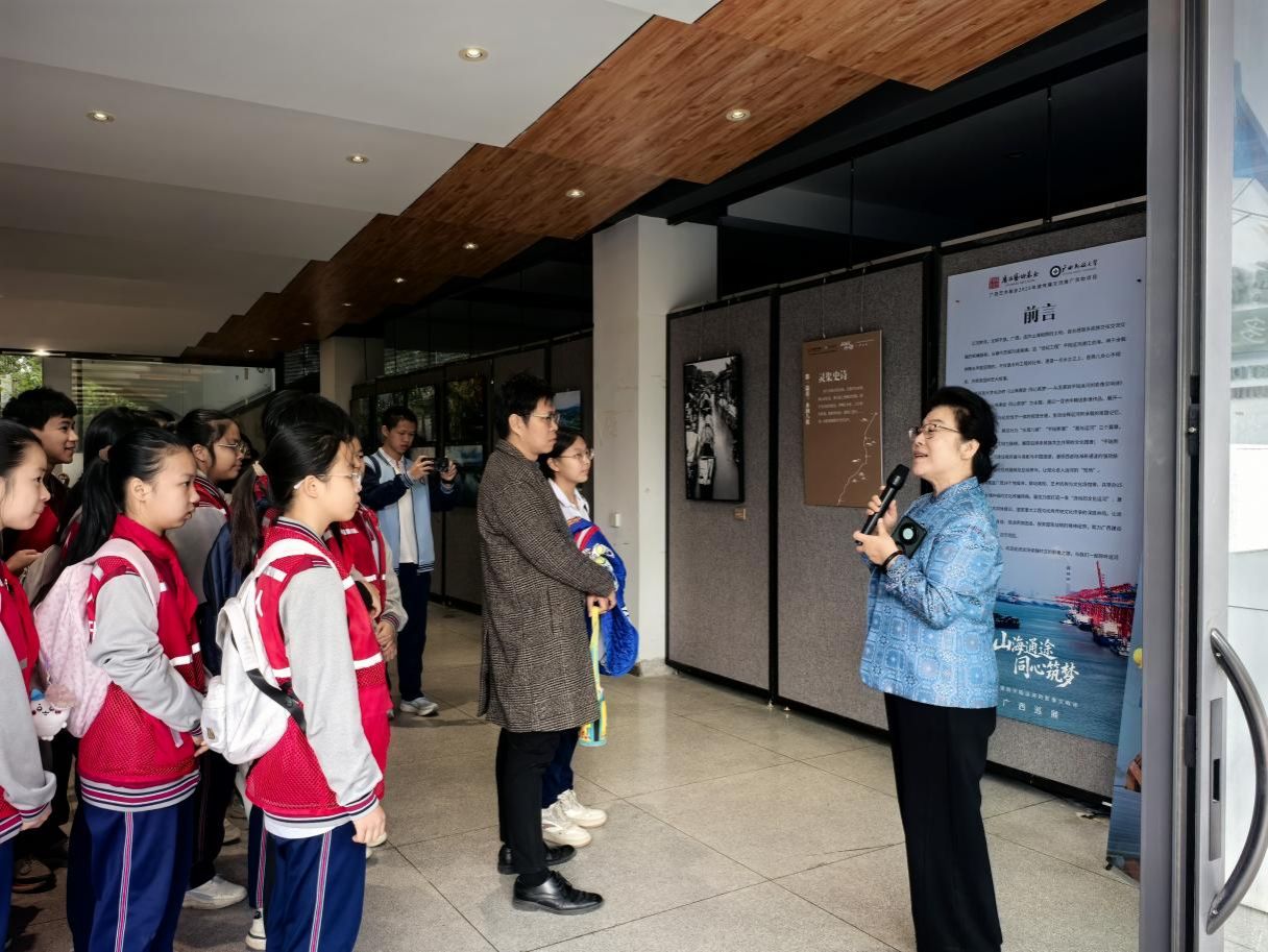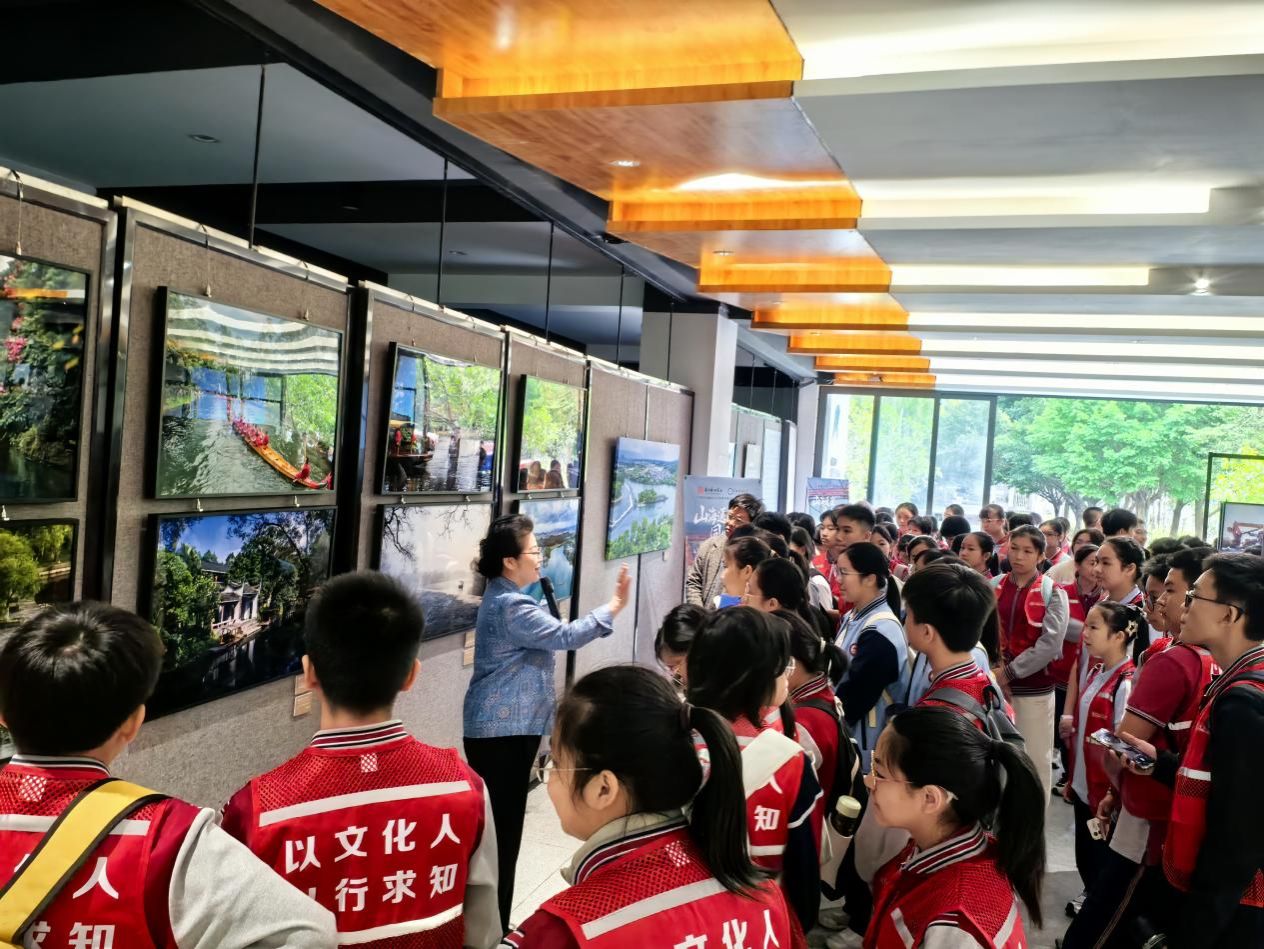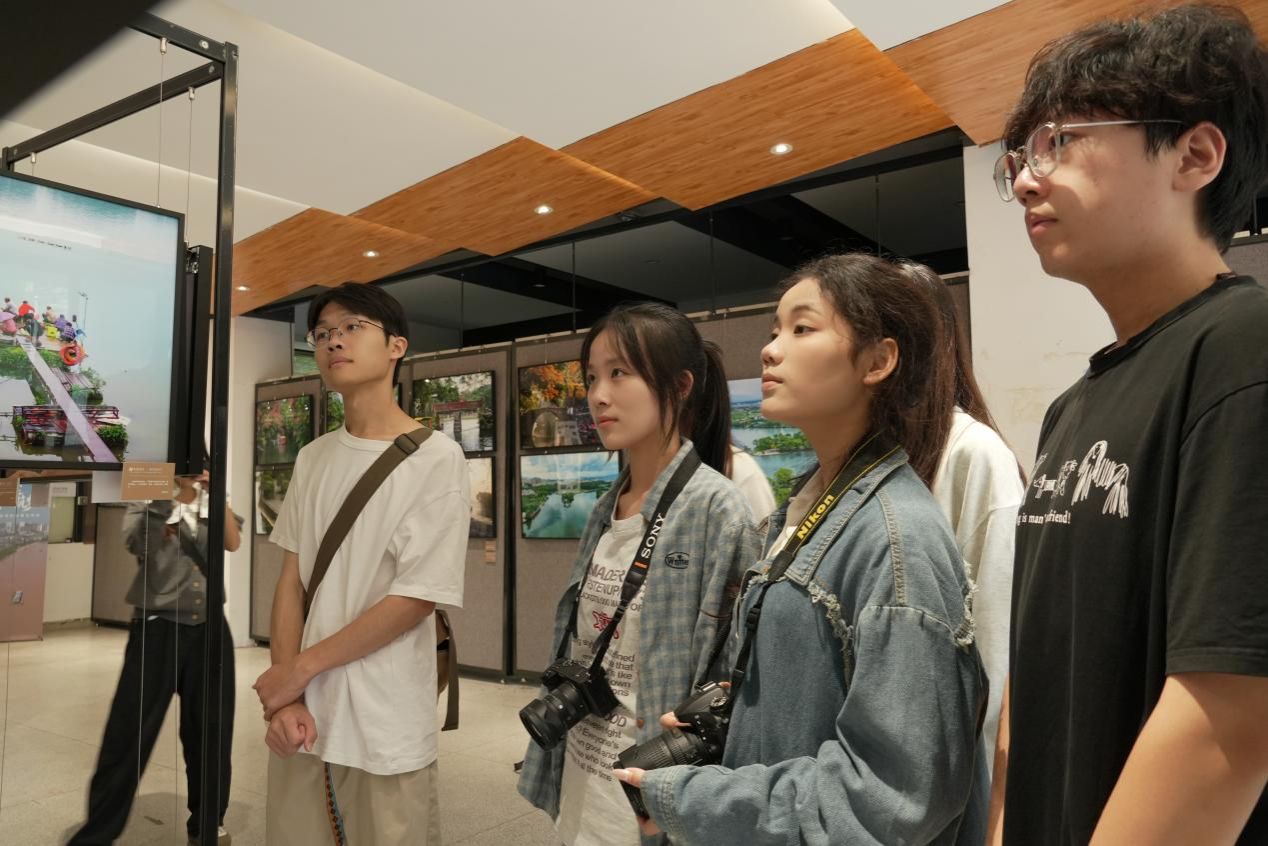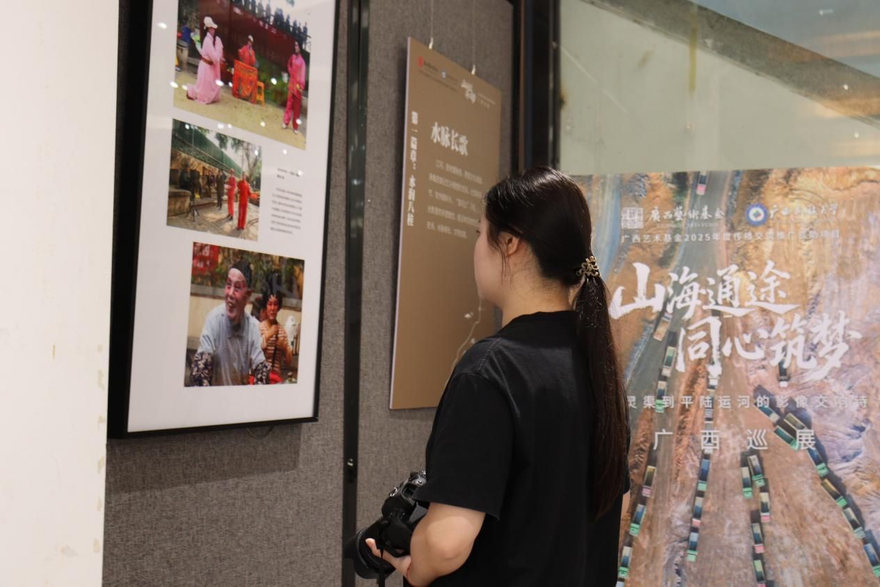 从秦朝灵渠的千年水波,到平陆运河的时代壮举,一幅幅影像静静铺陈,在梧州学子心中连接起一条跨越古今的“山海通途”。10月25日,广西民族大学主办的广西艺术基金2025年度传播交流推广资助项目《山海通途・同心筑梦——从灵渠到平陆运河的影像交响诗》广西巡展・梧州站进入展期第四天。虽临近尾声,展厅内依旧人流如织,于当日再度迎来观展小高潮。