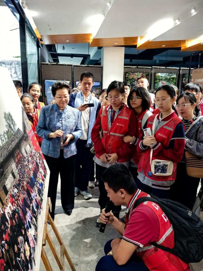 展览现场,杨学明与前来参观的学子们亲切互动,为他们深情讲述影像背后的家国故事。在一张全村大合照前,她邀请一位学生为大家朗读照片下的作品介绍。同学们得知村民从全国各地甚至海外归乡,只为在村落消失前留下集体记忆。短短百字,让同学们感受到重大工程的背后,既镌刻着普通百姓的奉献,更承载着国家的分量。