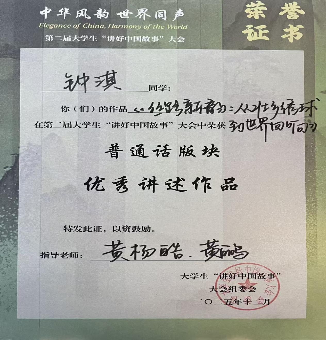 近日,第二届大学生“讲好中国故事”大会在上海戏剧学院圆满落幕。本届大会以“中华风韵·世界同声”为主题,由上海戏剧学院、中国电视艺术家协会青少年教育专业委员会指导,多所高校与研究中心联合承办,旨在为全国高校学子搭建传承中华文化、传播中国故事的优质平台。此次赛事中,我院学子表现优异,2024级播音与主持艺术专业钟淇同学凭作品《丝路新韵——从壮乡绣球到世界回响》入围全国总决选并荣获“优秀作品讲述奖”,2025级播音与主持艺术专业黄语晨同学凭作品《萌马踏出国门,驮起乡村新生》入围普通话版块全国复选并获得“经典传颂·叙事荣誉”,充分展现出我院学子扎实的专业素养和深厚的文化传播能力。