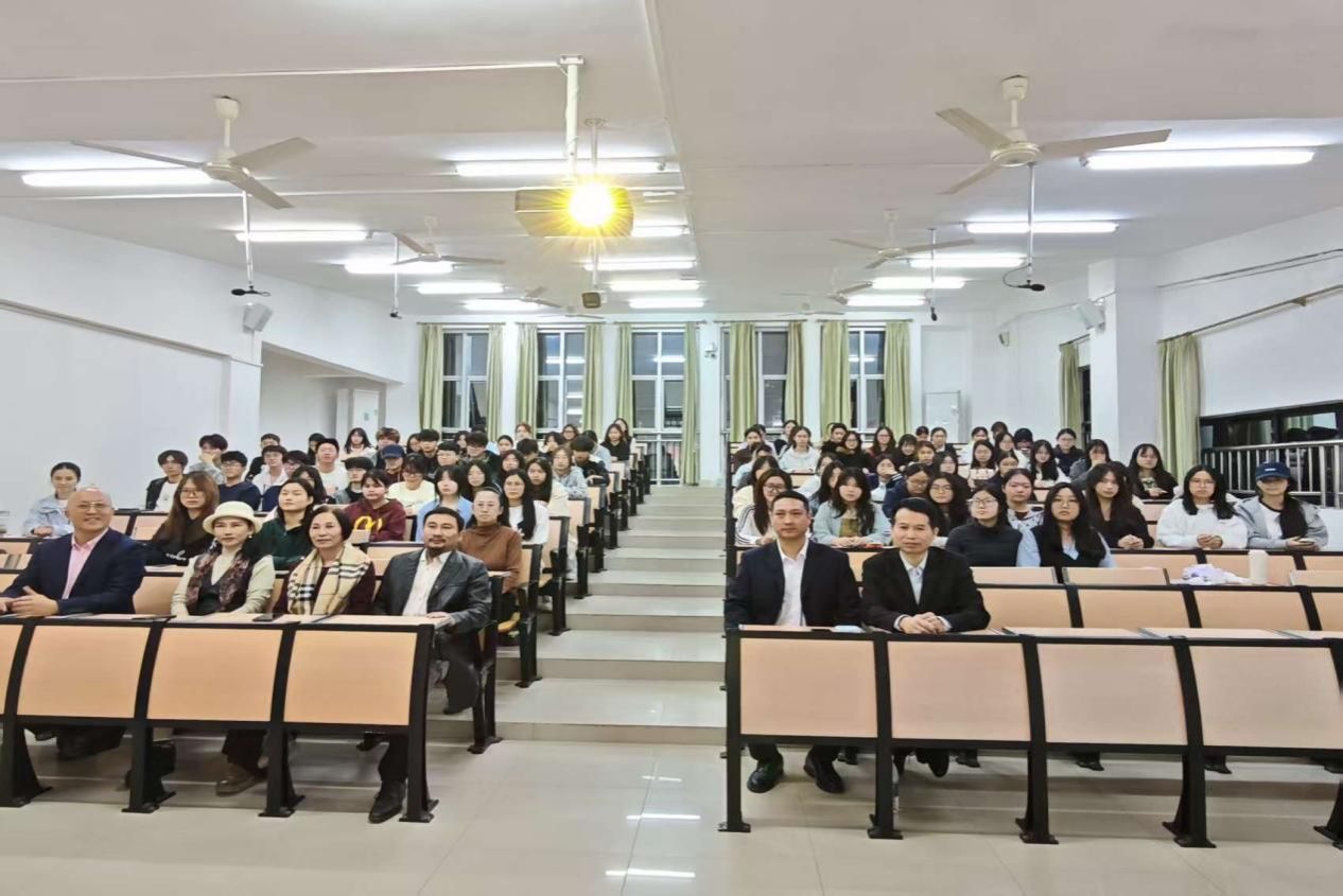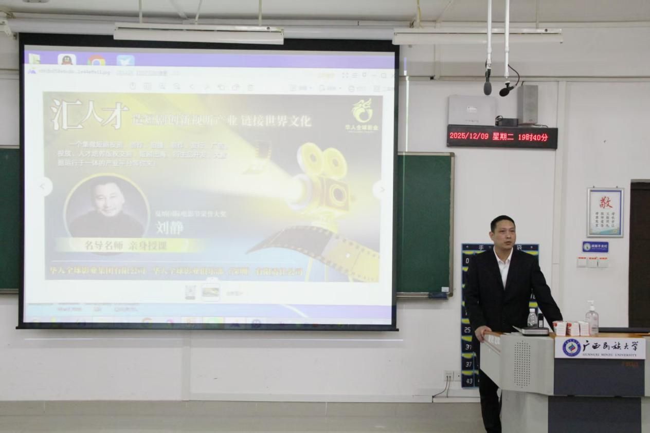 12月9日晚,博大(中国)大学生智慧就业创业服务平台总裁江细波,华人全球影业集团有限公司、华人全球影业俱乐部(深圳)导演刘静,制片人刘萌莅临我校明德楼312教室开展“影视传媒行业职业发展”主题讲座。2025级广播电视编导专业全体同学到场参加。