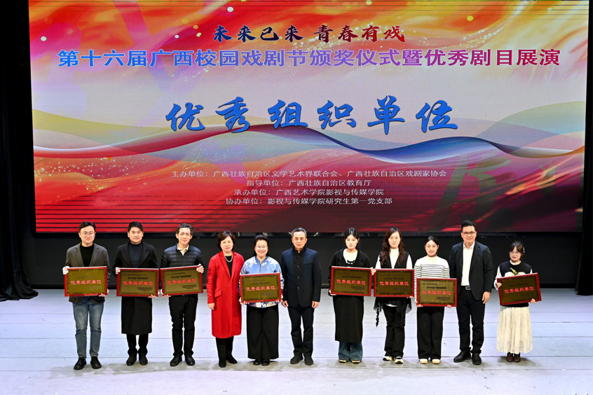 2025年12月5日晚,“第十六届广西校园戏剧节颁奖仪式暨优秀剧目展演”活动在南宁市三街两巷的人民剧院拉开帷幕。本次戏剧节以“未来已来·青春有戏”为题,由广西壮族自治区文学艺术界联合会、广西壮族自治区戏剧家协会主办,广西壮族自治区教育厅指导,广西艺术学院影视与传媒学院承办,旨在搭建全区高校戏剧艺术交流平台,提供青年戏剧人艺术实践机会,拓展艺术惠民服务维度,统筹推进戏剧艺术教育高质量发展。