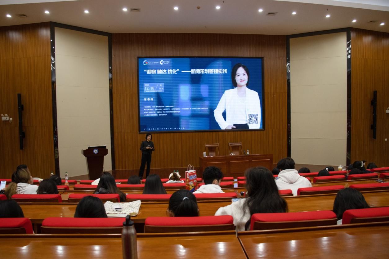 12月16日下午,高级编辑、广西广播电视台教育广播编辑部监制谢春梅受邀到我院开展《“洞察 触达 优化”——新闻策划管理实践》讲座,讲座在思源湖校区图书馆报告厅举行。新闻学教研室主任钱芷涵主持本次讲座。