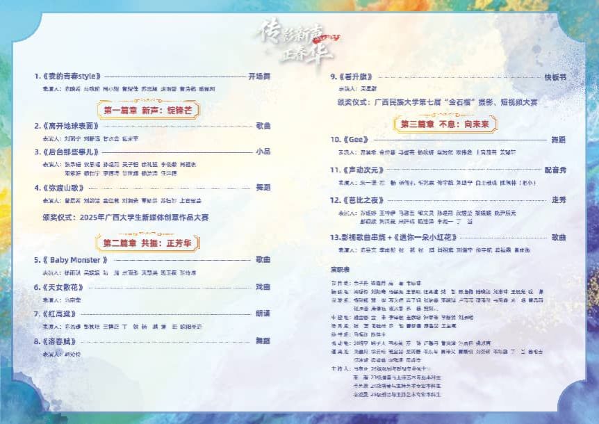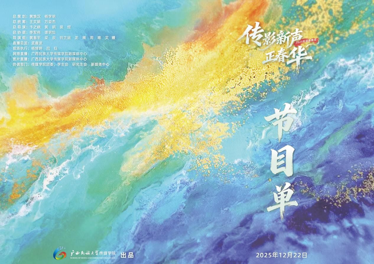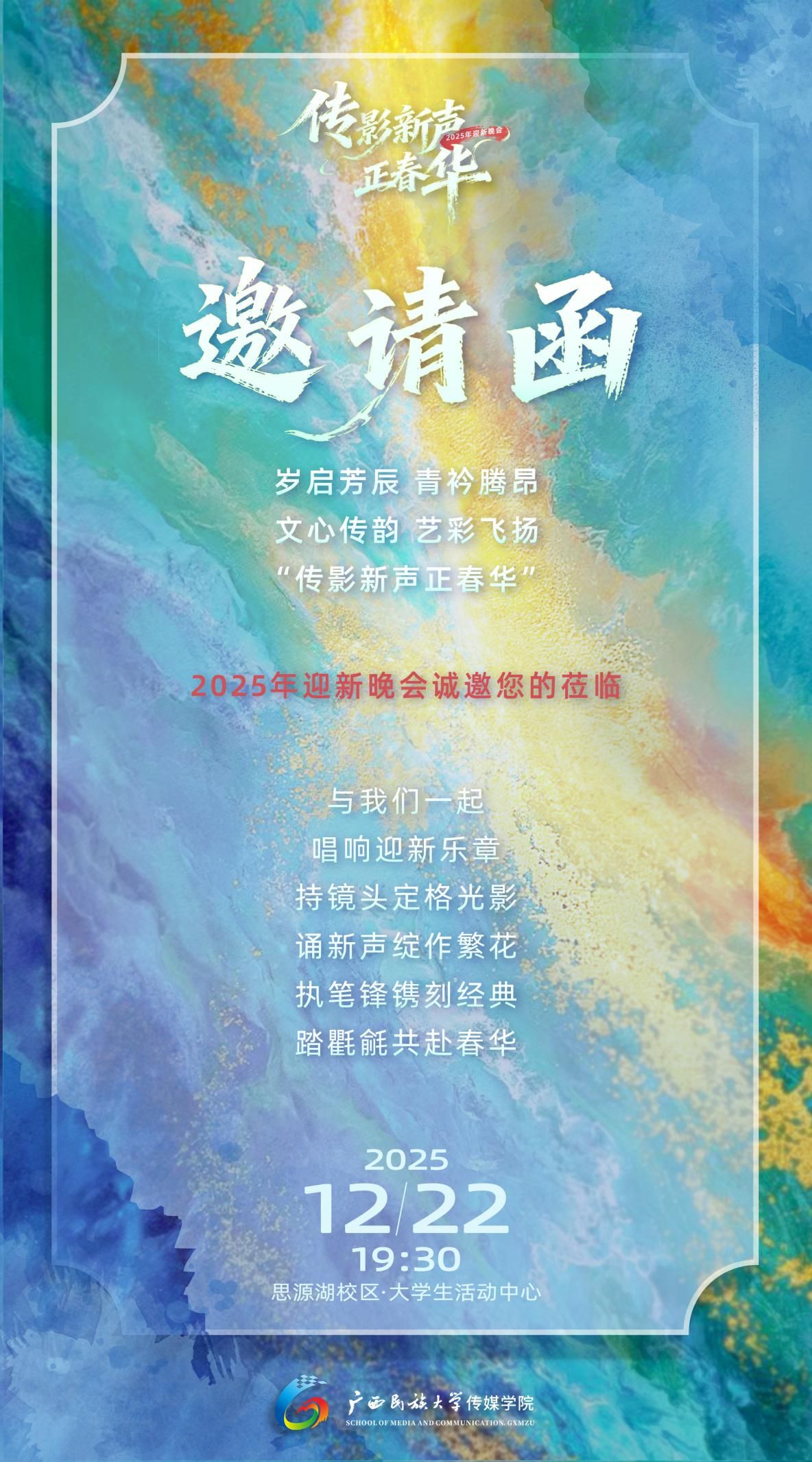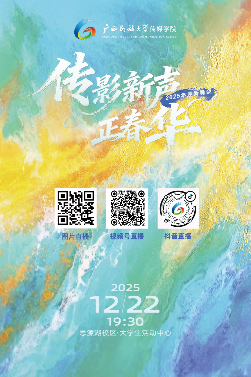 传影,定格青春第一帧;新声,唱响未来第一幕。 广西民族大学传媒学院2025年迎新晚会火热来袭!这里有最燃的舞台、最新的创意、最美的春华时光。12月22日19:30,直播通道即将开启,我们不见不散!