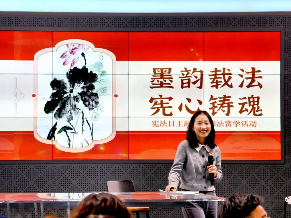 活动以“观·法之形”宪法书法微展厅环节开篇。现场展出师生党员创作的宪法主题书法作品,任勃雅结合专业素养,引导大家赏析楷书、创意书体等不同风格作品,解读“以法为尺”“清风法语”等作品中蕴含的宪法权威与廉洁理念,以艺术形式诠释法治内涵,为专题学习奠定认知基础。