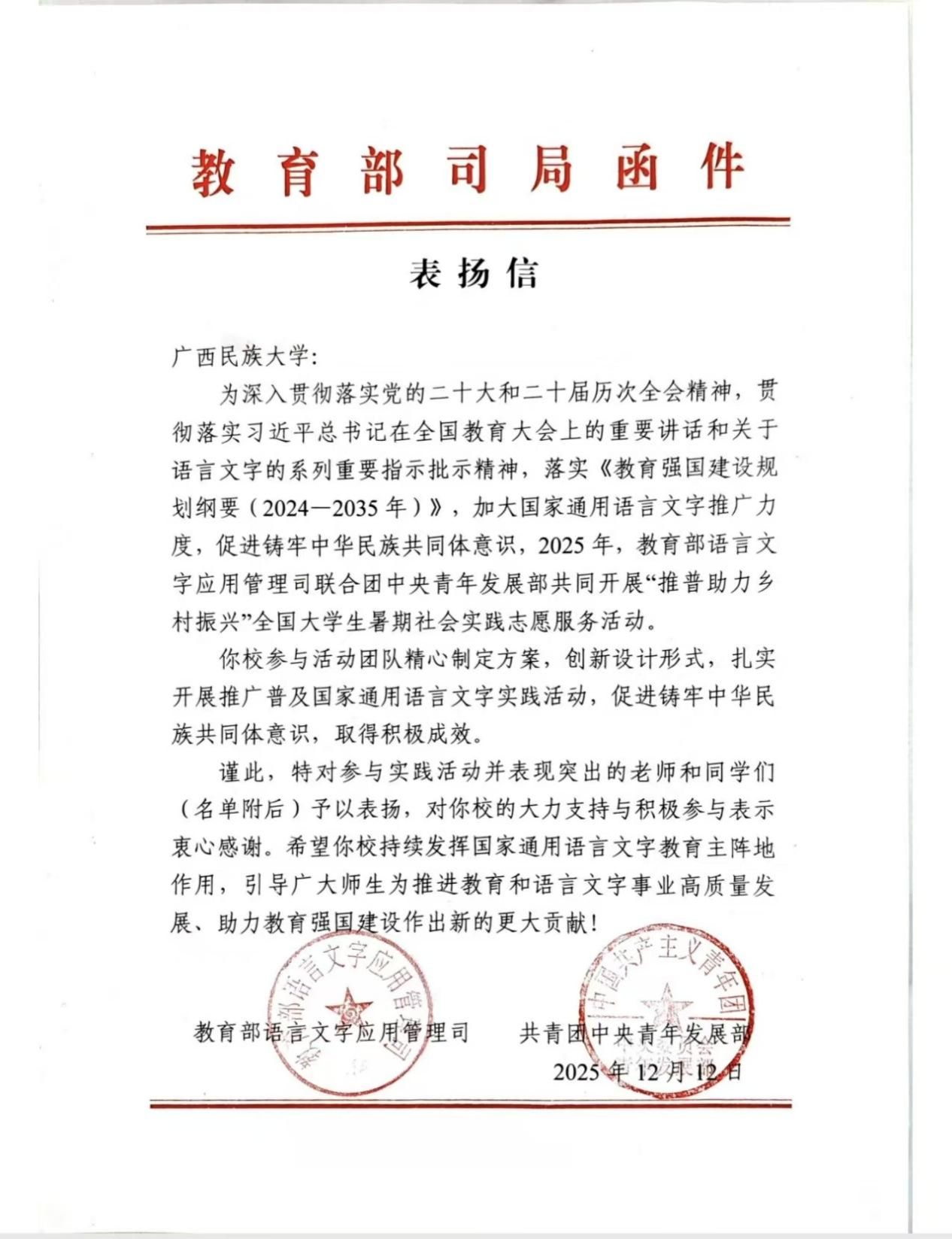 教育部与团中央在表扬信中充分肯定了团队的实践成果,并对我校的组织支持工作表示感谢。此次表彰既是对团队的高度认可,也是对我校实践育人工作的积极肯定。