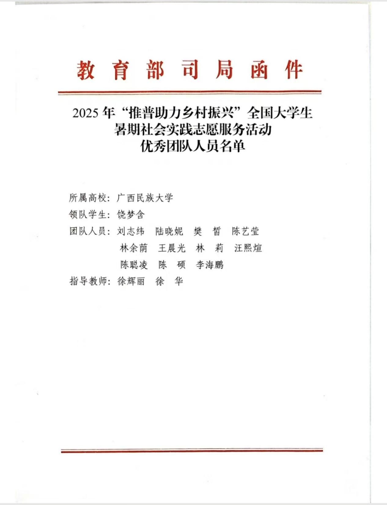 2025年12月12日,教育部语言文字应用管理司与共青团中央青年发展部联合对2025年“推普助力乡村振兴”全国大学生暑期社会实践志愿服务活动中表现突出的团队予以通报表扬。由我校传媒学院组织,徐辉丽、徐华、林余荫三位老师指导,饶梦含同学带领的暑期社会实践团荣获此项国家级表彰。