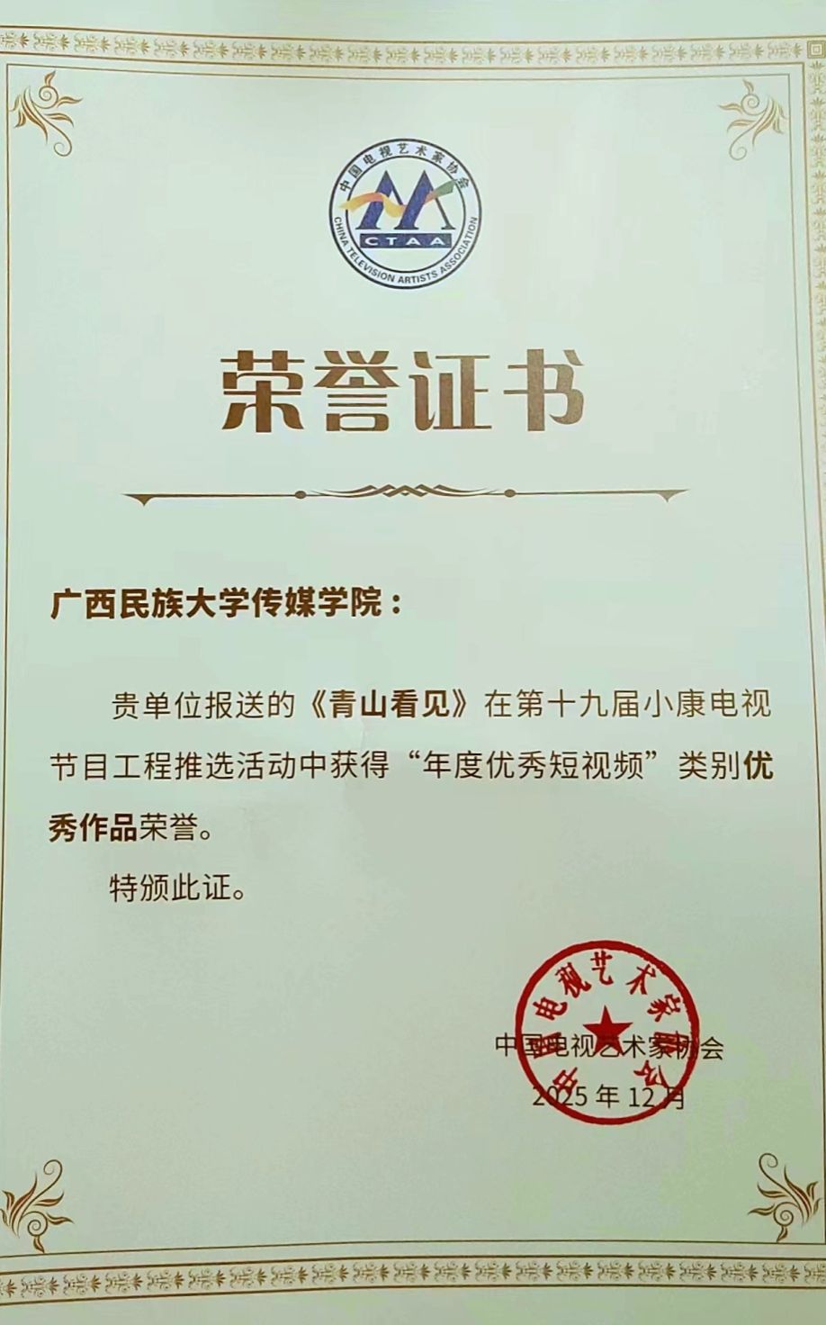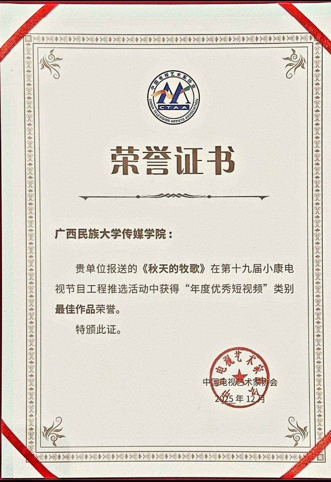 “年度优秀短视频”类别在全国范围内共评选出10部“最佳作品”,获奖作品由央视、新华社、中国农业电影电视中心、福建省广播影视集团、广西广播电视台等单位选送。由我院教师李荣胜指导的短视频作品《秋天的牧歌》(作者:刘淑怡、邱彦南、刘蔓蔓)荣获“年度优秀短视频·最佳作品”奖;另一部作品《青山看见》(作者:黄景足、庞晴心)荣获“年度优秀短视频·优秀作品”奖。