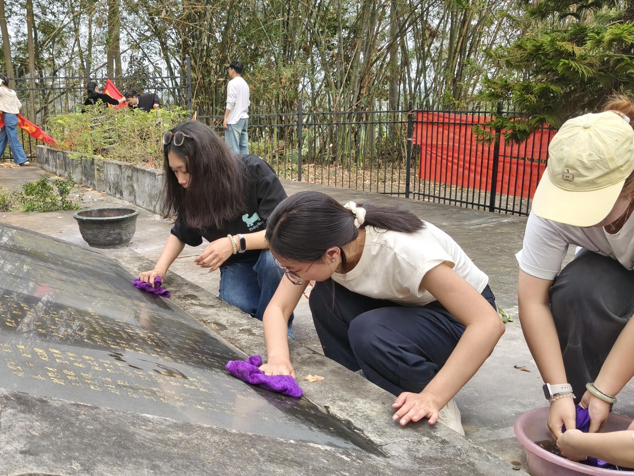 随后,党员们分工协作,对革命公墓进行全面清扫整理。大家手持工具清理步道与墓区杂物、擦拭墓碑表面灰尘与污垢;对部分字迹模糊、褪色不清的墓碑用毛笔进行补色,还原英烈姓名与事迹;对园内参差不齐的灌木进行修剪整形,清除杂草枯枝,优化墓园整体环境。大家以一丝不苟的态度,用双手守护英烈安息之地,以实际行动践行“奉献、友爱、互助、进步”的自愿精神。