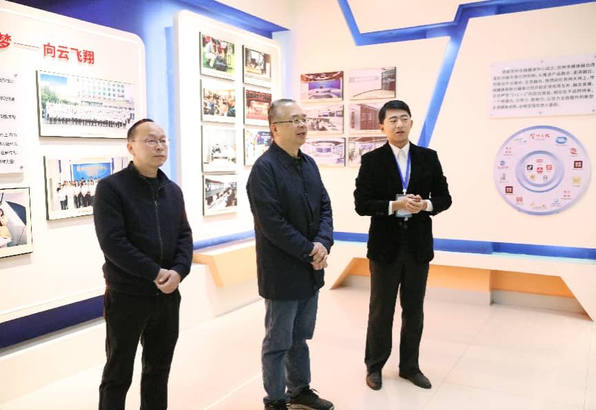 黄春平参观贺州市融媒体中心发展历程展厅(左一为贺州市融媒体中心副主任林辉)