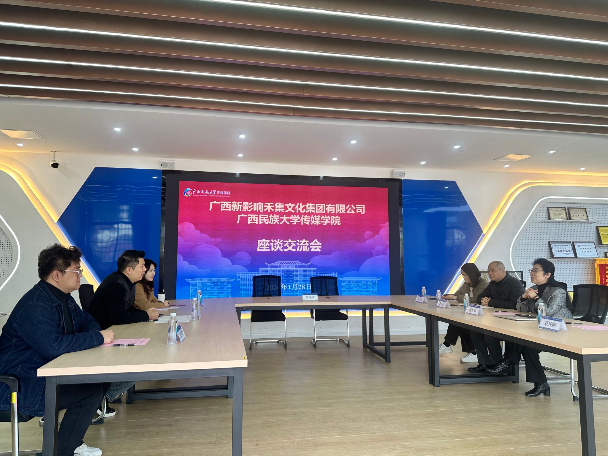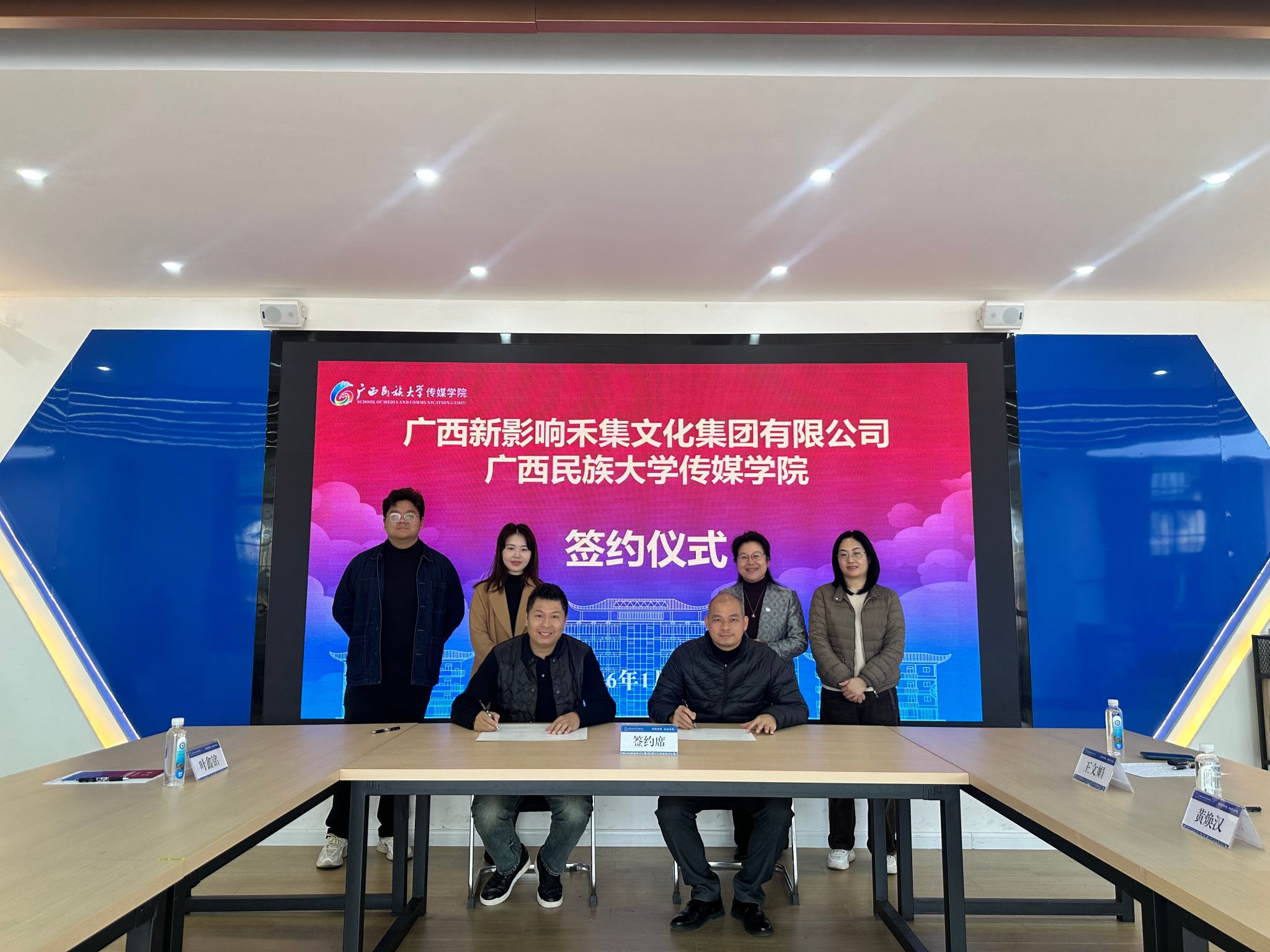 1月28日上午,学院与广西新影响禾集文化集团有限公司在明德楼一楼大厅举行校企合作座谈会暨签约仪式。广西新影响禾集文化集团有限公司执行总裁张飞、市场总监叶鑫铭、AI技术员黄正浩到访交流。学院党委书记黄焕汉、院长杨学明、副院长王文娟、团委书记蒙丹妮出席座谈并见证签约。