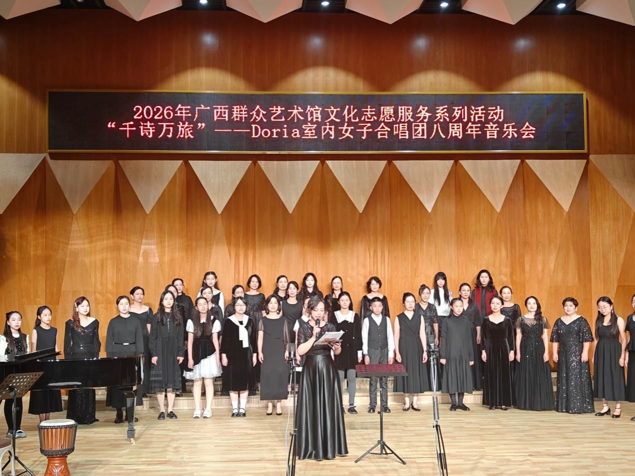 揭牌仪式前后,杨学明一行了解了广西群众艺术馆的发展历程和近年来的丰硕成果,并现场观摩了2026年文化志愿服务系列活动“千诗万旅”——Doria室内女子合唱团八周年音乐会演出,为今后的文化传播创作提供了鲜活的灵感。