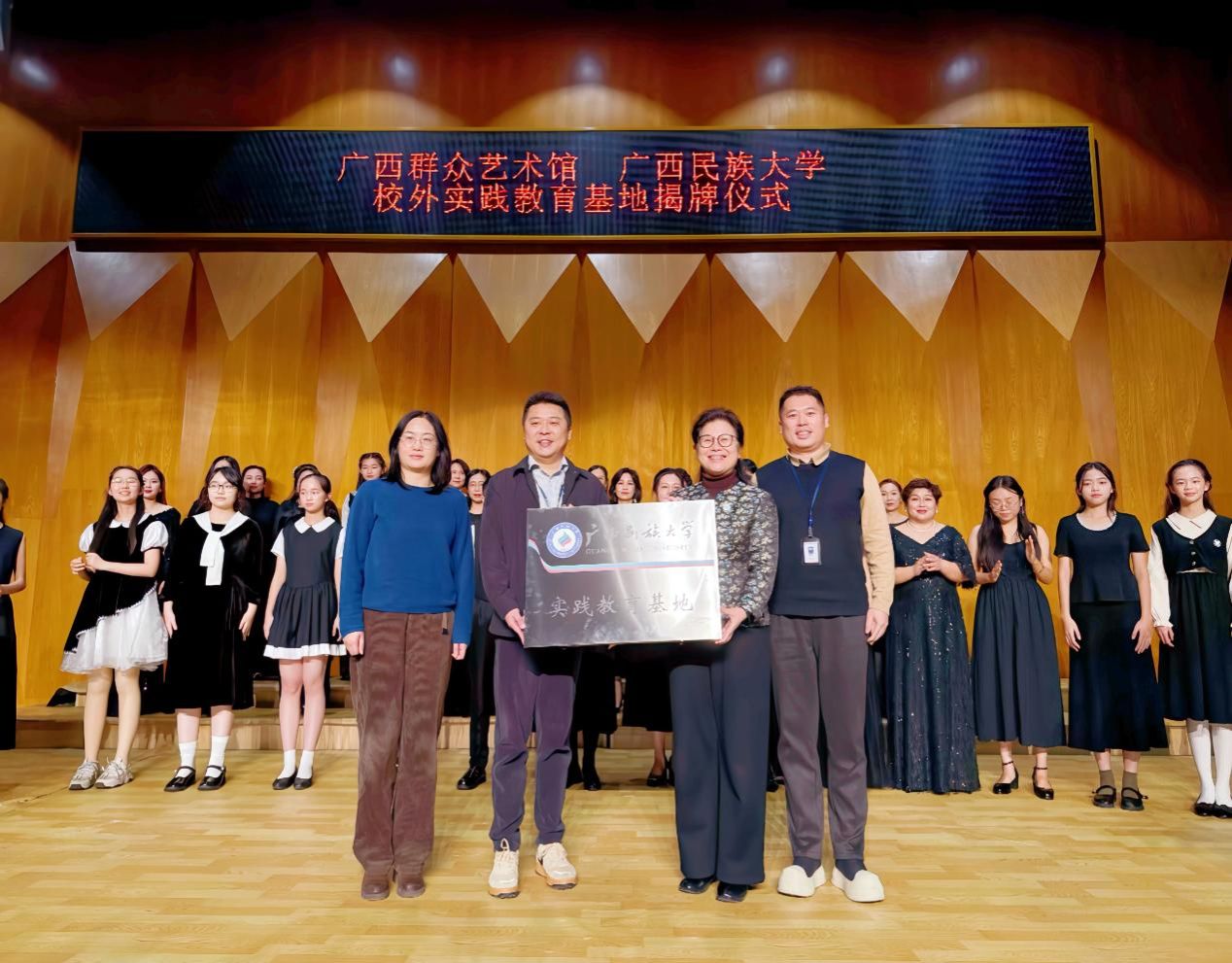 1月17日晚,我院与广西群众艺术馆共建校外实践教育基地揭牌仪式在广西群众艺术馆音乐厅举行,双方共同签署协议并揭牌。广西群众艺术馆党委委员,文化志愿服务管理部主任左高军、文化志愿服务管理部副主任罗夏,我院院长杨学明、副院长王文娟、团委书记蒙丹妮参加揭牌仪式。